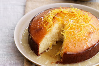 8. 把細絲狀的檸檬皮以及糖漿,用湯匙反覆澆淋在蛋糕上,讓蛋糕慢慢吸收,待涼後即可上桌開動。
